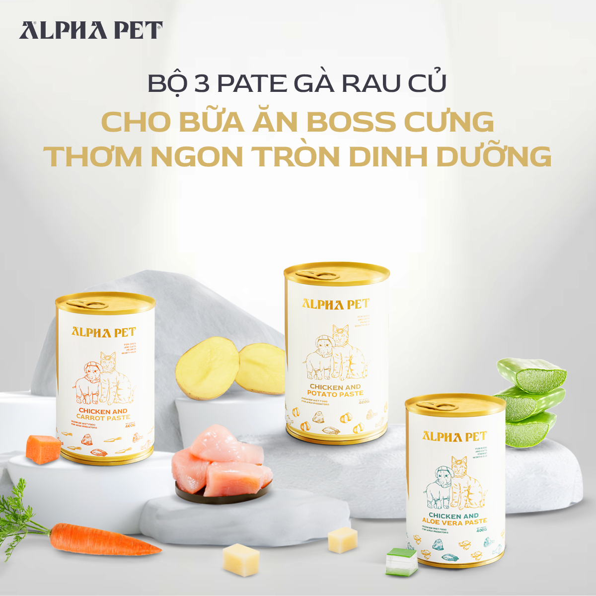 Pate Alpha Pet Bộ 3 Ức Gà là giải pháp dinh dưỡng tiện lợi dành cho chó mèo, đặc biệt phù hợp với Boss kén ăn, hệ tiêu hóa nhạy