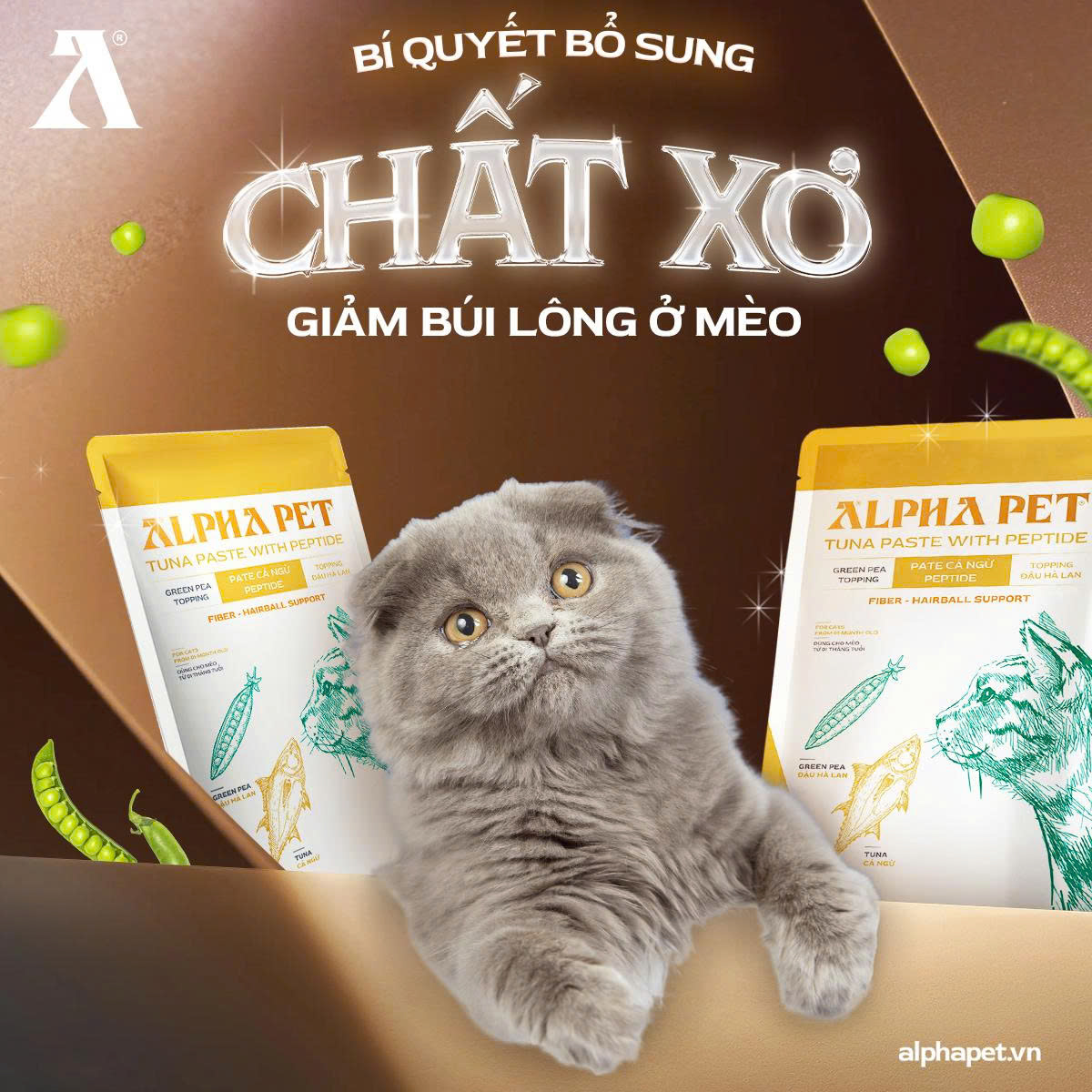 Pate Alpha Pet Peptide Topping Đậu Hà Lan là lựa chọn phù hợp cho mèo cần hỗ trợ tiêu hóa, hạn chế táo bón và giảm hình thành búi lông.